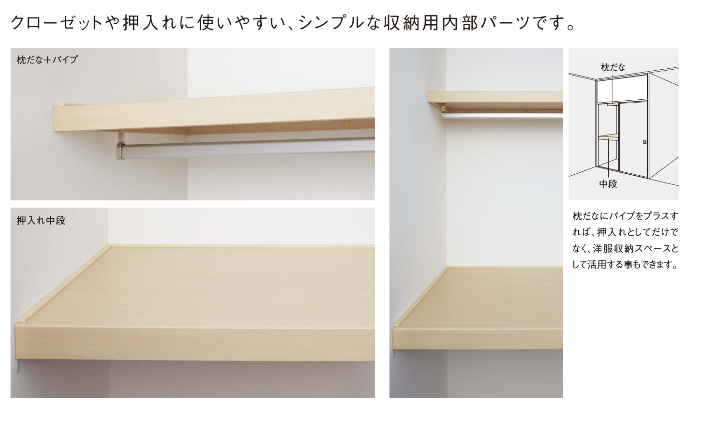 クローゼットや押入れに使いやすいシンプルな収納用内部パーツ
